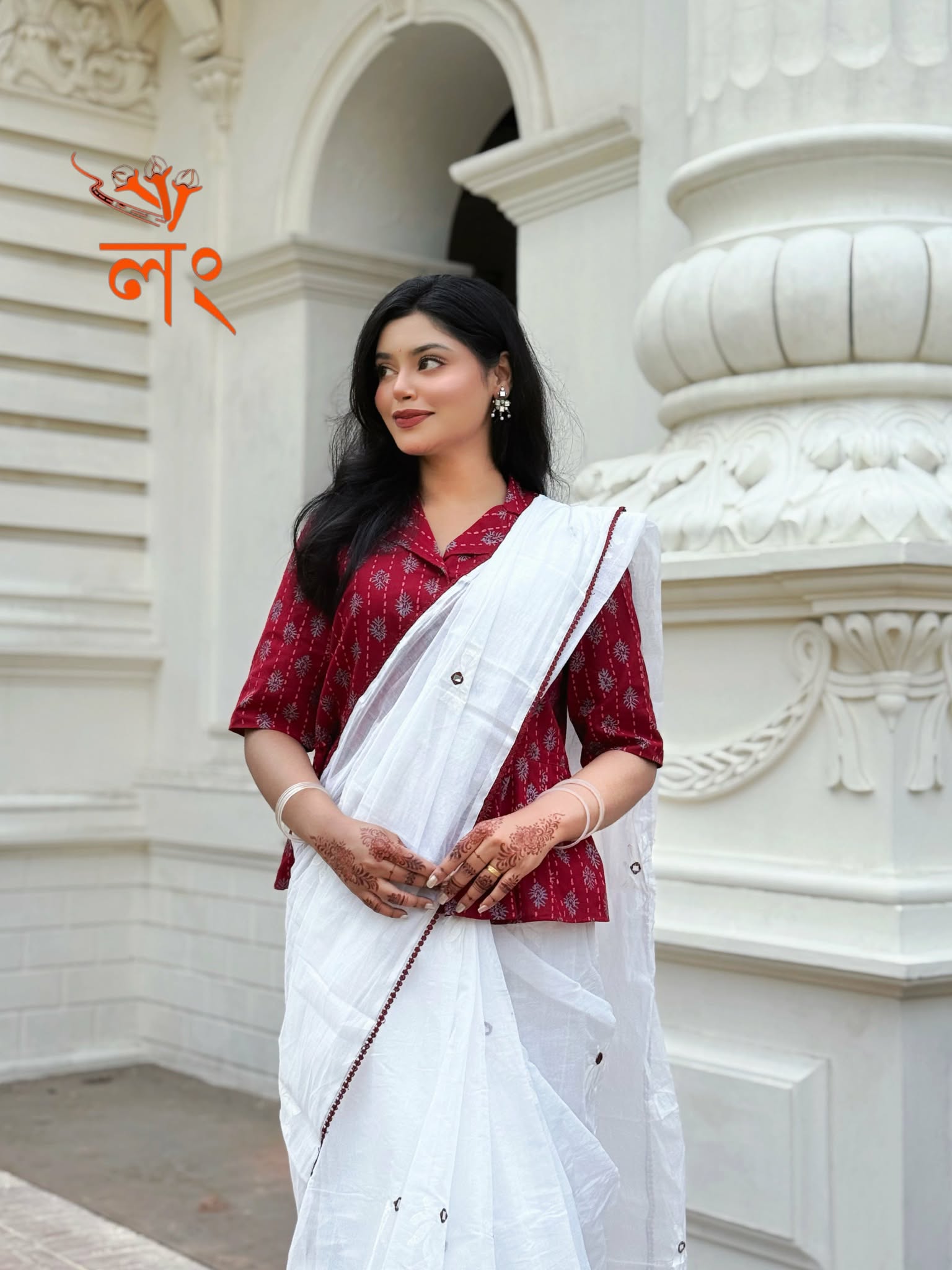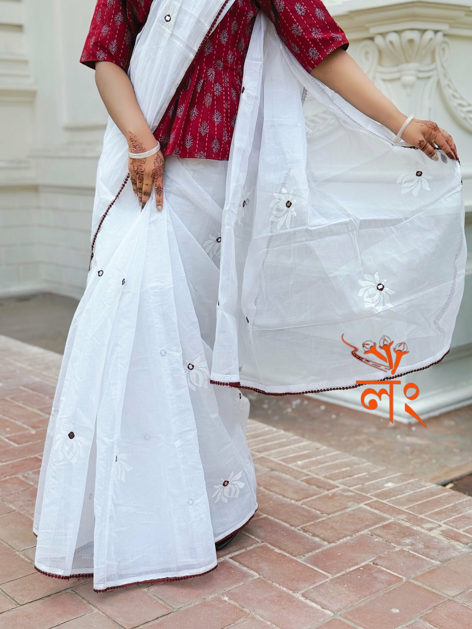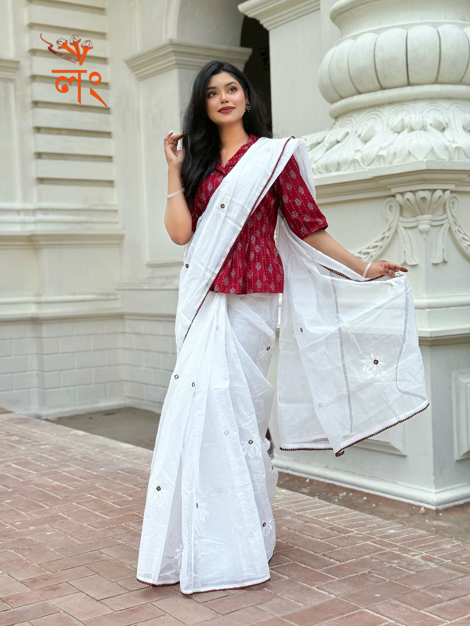 শাড়ির বিবরন:- সফট সেমি মসলিন ১৪ হাত কাপড়ে কাঠ ব্লক, এমব্রয়ডারি এবং লেইস ওয়ার্ক করা হয়েছে।