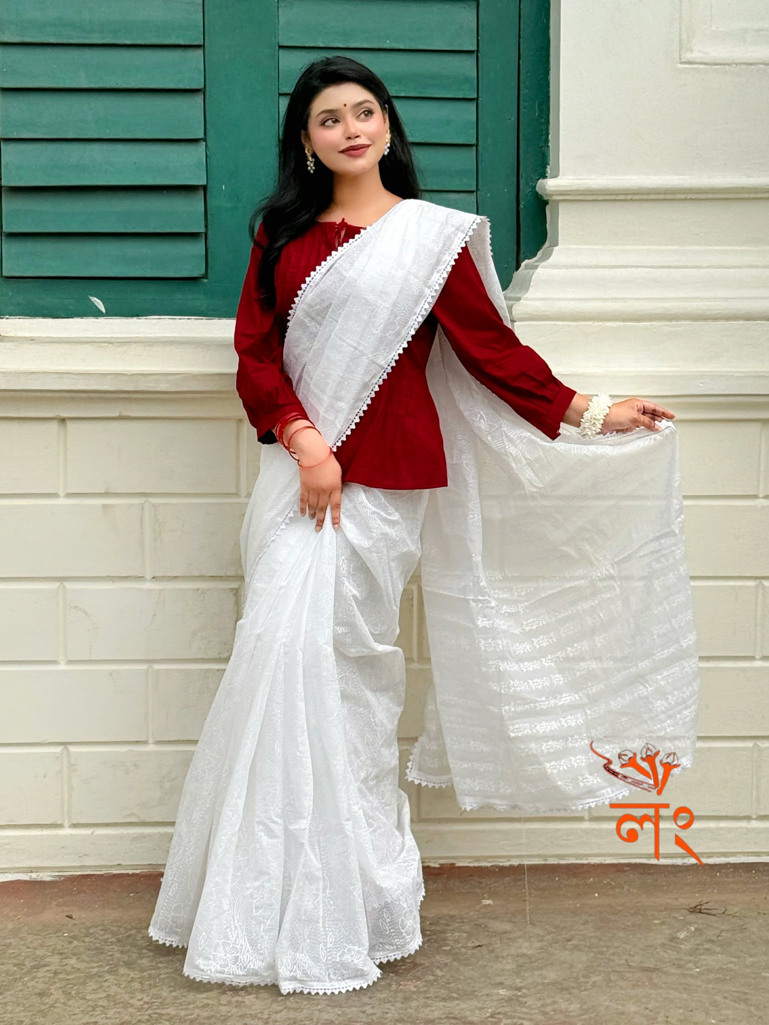 শাড়ির বিবরন:- সফট সেমি মসলিন ১৪ হাত কাপড়ে কাঠ ব্লক এবং লেইস ওয়ার্ক করা হয়েছে।