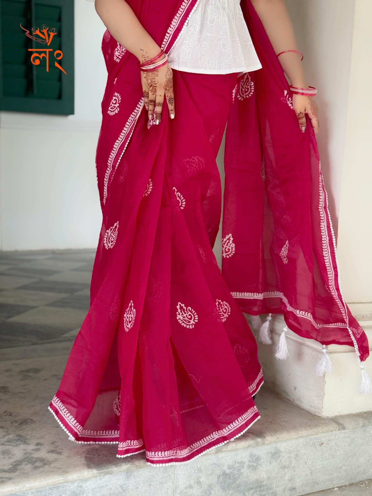 শাড়ির বিবরন:- সফট সেমি মসলিন ১৪ হাত কাপড়ে কাঠ ব্লক এবং লেইস ওয়ার্ক করা হয়েছে।