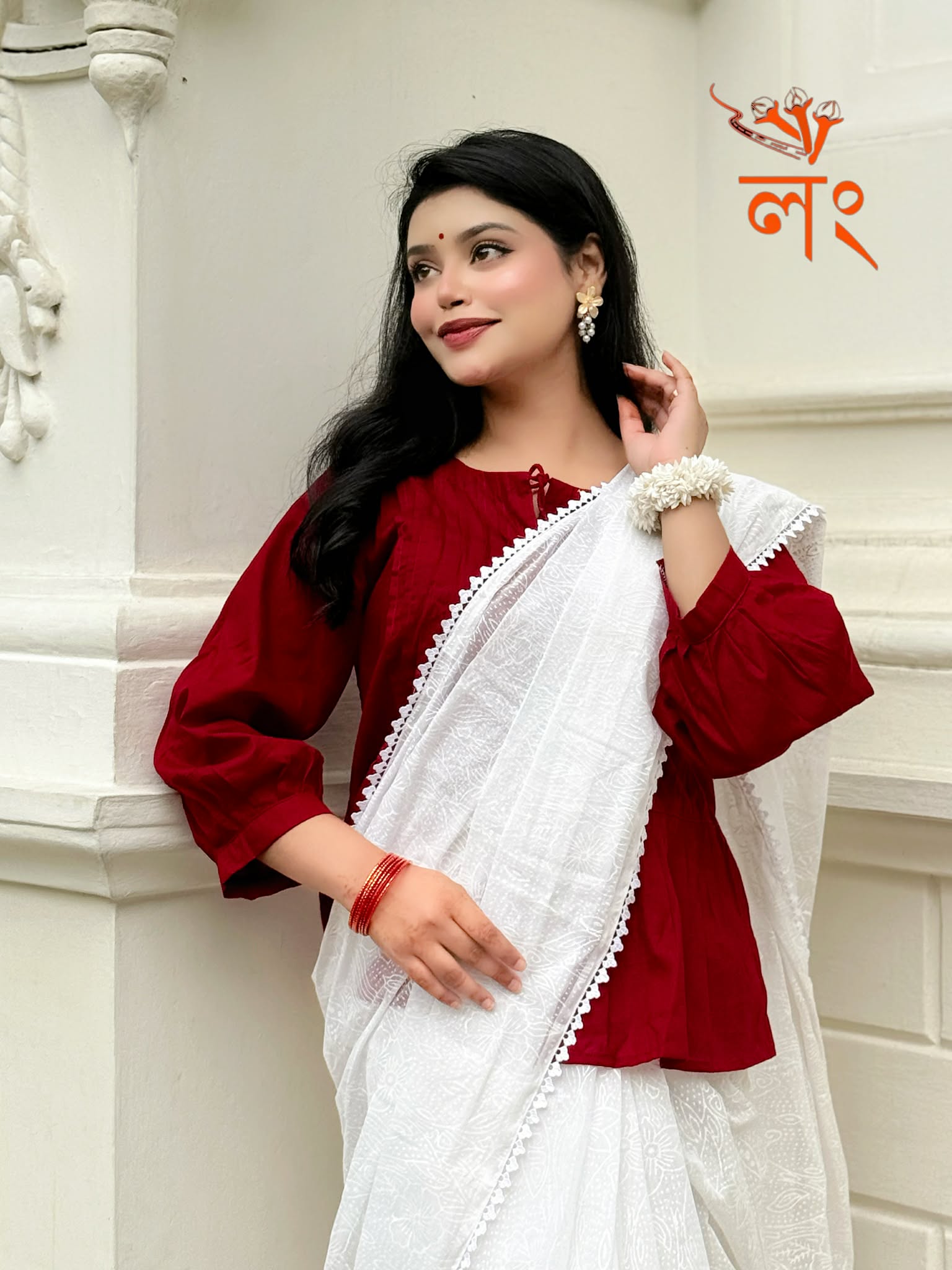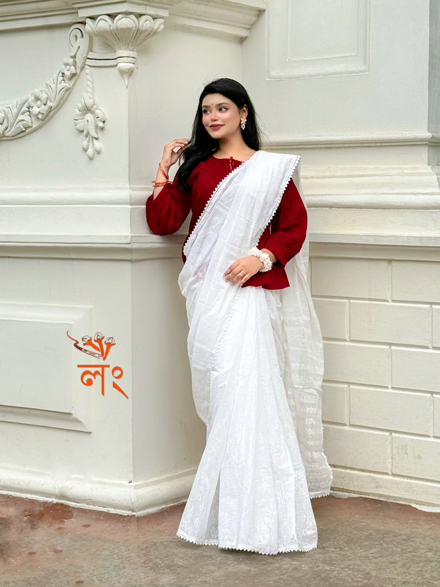 শাড়ির বিবরন:- সফট সেমি মসলিন ১৪ হাত কাপড়ে কাঠ ব্লক এবং লেইস ওয়ার্ক করা হয়েছে।