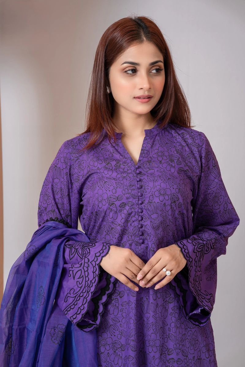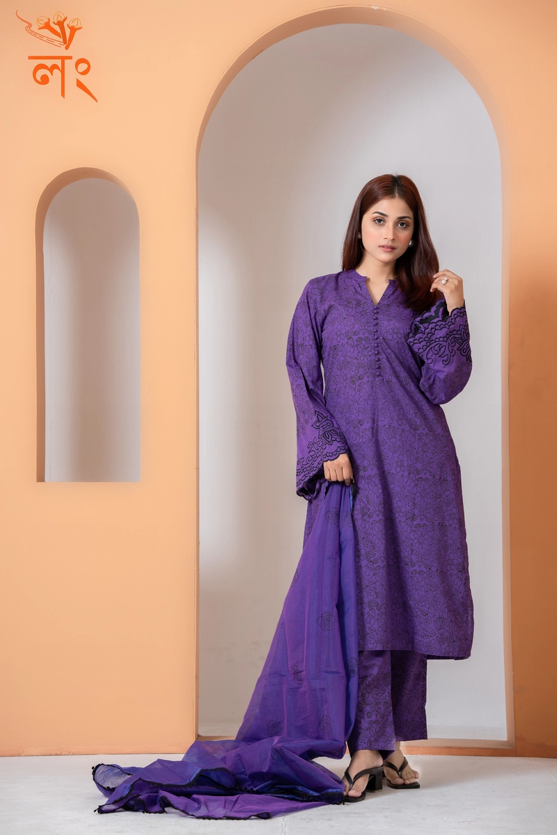 কাজের বিবরন : সেমি মসলিন ফেব্রিকে কাঠ ব্লক কাজ সেই সাথে লেইস ওয়ার্ক করা হয়েছে।।