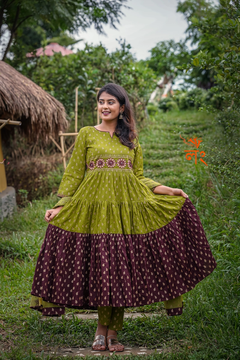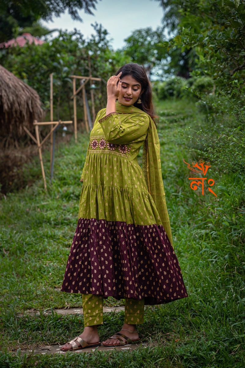 অনেকগুলো লেয়ারে তৈরি এই আনারকলি স্টাইলের ড্রেসটিতে রয়েছে সম্পূর্ণ নিজস্ব ডিজাইনে কাঠ ব্লক প্রিন্ট ও এমব্রয়ডারি কাজ। প্রায় ১৩ গজ কাপড় ব্যবহৃত হয়েছে, আর দেওয়া হয়েছে অতিরিক্ত ফ্লেয়ার/ঘের, যা পোশাকে এনে দেবে রাজকীয় সৌন্দর্য।