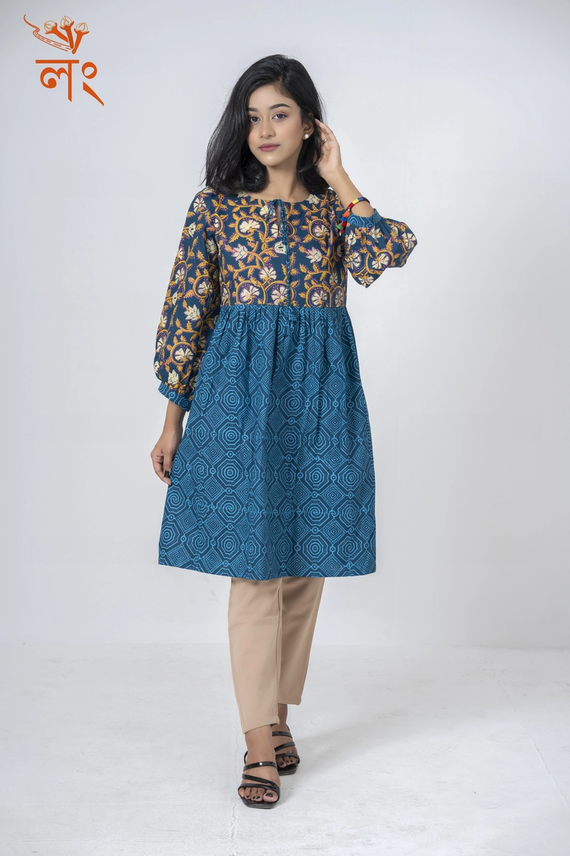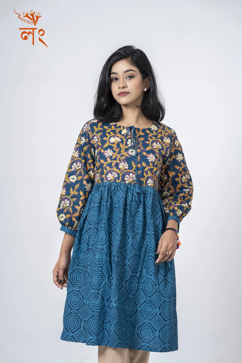 ফেব্রিক :- কটনকাজের বিবরন :- কটন কাপড়ে কাঠ ব্লক প্রিন্ট করা হয়েছে।।সাইজ :- ৩৬ টু ৪৬ এভেইলেবল।।লেন্থ :- 38